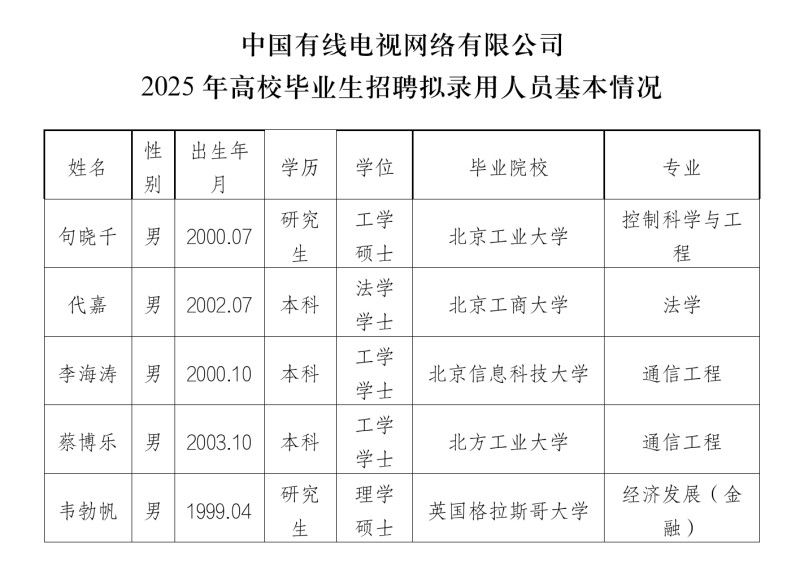 中国有线电视网络有限公司根据2025年高校毕业生接收计划,经资格审查、笔试、面试、考察等程序,拟录用句晓千、代嘉、李海涛、蔡博乐、韦勃帆共五名人员,现将有关情况予以公示,公示时间为公布之日起7个工作日。公示期间如有异议,请向中国有线电视网络有限公司人力资源部反映,联系电话:010-88223053。
